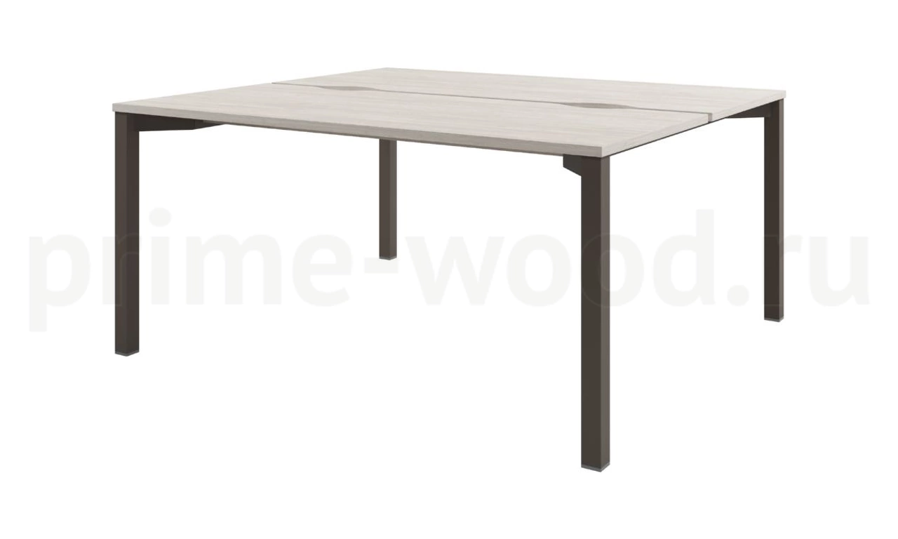 Стол-тандем на 2 рабочих места. Опоры стола - труба сечением 50*50. Траверсы заглублены на 196 мм. Между столешницами зазор 32 мм для установки фронтального экрана. На длинной стороне столешниц сделаны вырезы для организации кабель-менеджмента. Цвет металлокаркаса "Кашемир" и "Трюфель", текстура – муар